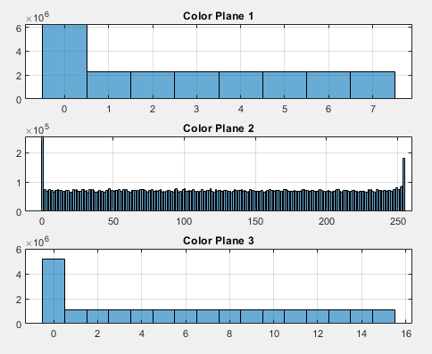 为了解码这些值,我做了一次扫描,覆盖了扫描仪的整个测量范围,包括在开始和结束时的一些超出范围的值。如果你看看每个彩色平面的值的分布,你可以看到,第一个和第三个平面实际上只使用8/16的值,这意味着只有3/4位。这也是可见的图像本身,因为它主要显示绿色。