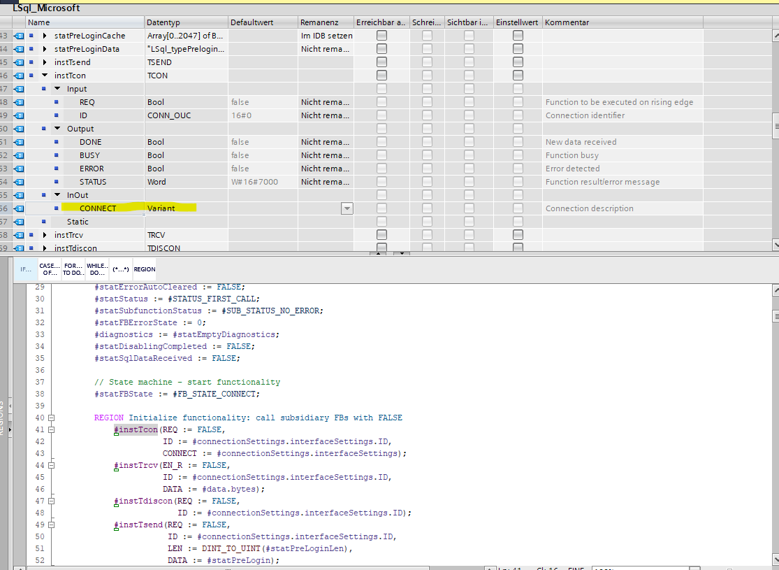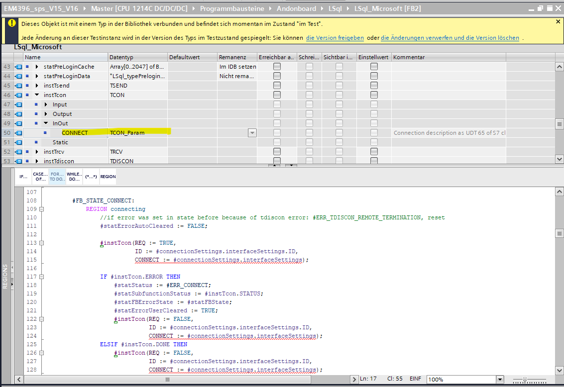 我正在集成SQL连接到一个或我们现有的西门子S7-1200 PLC现在.从工作项目复制函数块后,其中一种数据类型已经更改,现在正在造成麻烦。