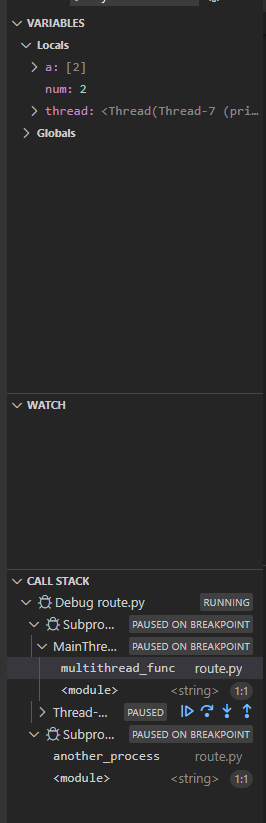 然后,在使用调试函数时,可以查看每个线程的状态,包括变量和左侧控制线程的按钮。