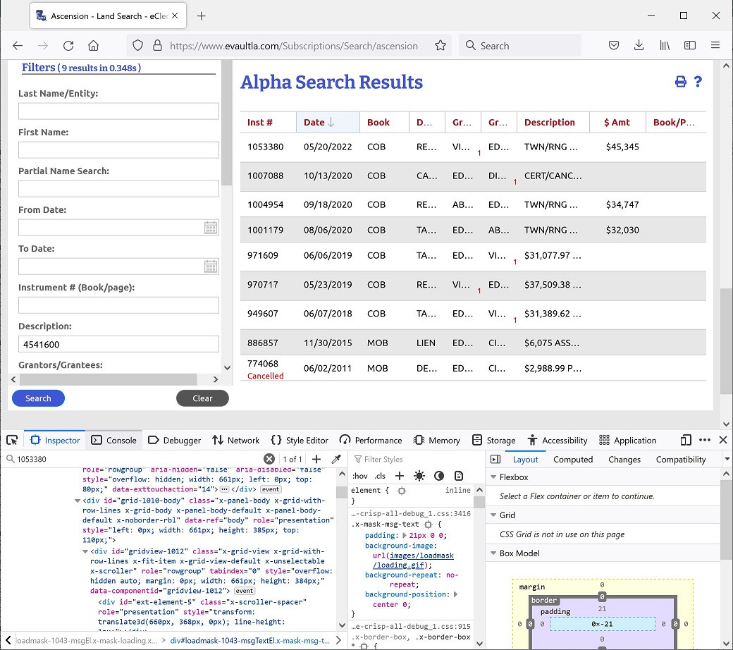 https://www.evaultla.com/Subscriptions/Search/ascension但它在50美元的付费墙后面。搜索结果中的数据不在“查看源”中,但它们位于DevTools代码检查器中,如图像底部所示。因此,这允许我从结果表中获取数据,除了一件事。