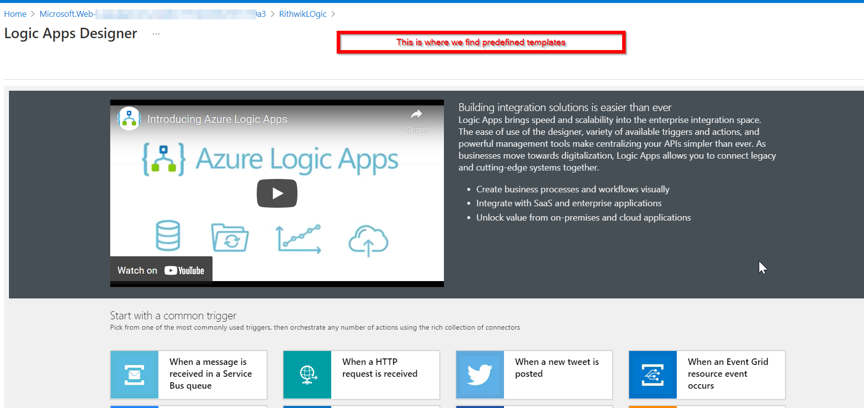 当您打开逻辑应用程序时,您将获得默认模板。