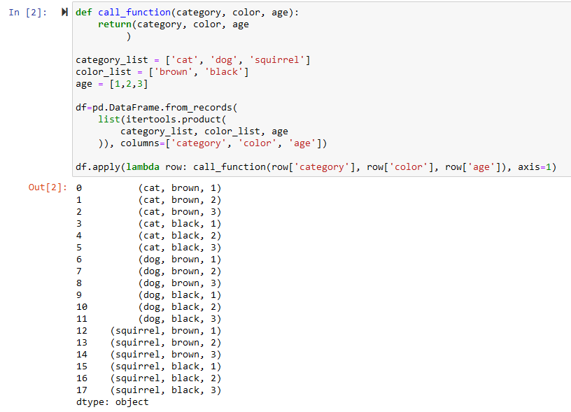 df.apply(lambda row: call_function(row['category'], row['color'], row['age']), axis=1)结果: