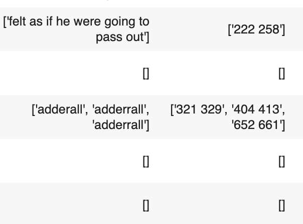 * df = pd.DataFrame({'id': {0: '00016_000', 1: '00016_001', 2: '00016_002', 3: '00016_003', 4: '00016_004', 5: '00016_005', 6: '00016_006', 7: '00016_007', 8: '00016_008', 9: '00016_009', 10: '00016_010', 11: '00016_011', 12: '00016_012'}, 'case_num': {0: 0, 1: 0, 2: 0, 3: 0, 4: 0, 5: 0, 6: 0, 7: 0, 8: 0, 9: 0, 10: 0, 11: 0, 12: 0}, 'pn_num': {0: 16, 1: 16, 2: 16, 3: 16, 4: 16, 5: 16, 6: 16, 7: 16, 8: 16, 9: 16, 10: 16, 11: 16, 12: 16}, 'feature_num': {0: 0, 1: 1, 2: 2, 3: 3, 4: 4, 5: 5, 6: 6, 7: 7, 8: 8, 9: 9, 10: 10, 11: 11, 12: 12}, 'annotation': {0: "['dad with recent heart attcak']", 1: '[\'mom with "thyroid disease\']', 2: "['chest pressure']", 3: "['intermittent episodes', 'episode']", 4: "['felt as if he were going to pass out']", 5: '[]', 6: "['adderall', 'adderrall', 'adderrall']", 7: '[]', 8: '[]', 9: "['palpitations', 'heart beating/pounding']", 10: "['3-4 months of']", 11: "['17yo']", 12: "['M']"}, 'location': {0: "['696 724']", 1: "['668 693']", 2: "['203 217']", 3: "['70 91', '176 183']", 4: "['222 258']", 5: '[]', 6: "['321 329', '404 413', '652 661']", 7: '[]', 8: '[]', 9: "['26 38', '96 118']", 10: "['56 69']", 11: "['5 9']", 12: "['10 11']"}, 'feature_text': {0: 'Family-history-of-MI-OR-Family-history-of-myocardial-infarction', 1: 'Family-history-of-thyroid-disorder', 2: 'Chest-pressure', 3: 'Intermittent-symptoms', 4: 'Lightheaded', 5: 'No-hair-changes-OR-no-nail-changes-OR-no-temperature-intolerance', 6: 'Adderall-use', 7: 'Shortness-of-breath', 8: 'Caffeine-use', 9: 'heart-pounding-OR-heart-racing', 10: 'Few-months-duration', 11: '17-year', 12: 'Male'}, 'pn_history': {0: 'HPI: 17yo M presents with palpitations. Patient reports 3-4 months of intermittent episodes of "heart beating/pounding out of my chest." 2 days ago during a soccer game had an episode, but this time had chest pressure and felt as if he were going to pass out (did not lose conciousness). Of note patient endorses abusing adderall, primarily to study (1-3 times per week). Before recent soccer game, took adderrall night before and morning of game. Denies shortness of breath, diaphoresis, fevers, chills, headache, fatigue, changes in sleep, changes in vision/hearing, abdominal paun, changes in bowel or urinary habits. \r\nPMHx: none\r\nRx: uses friends adderrall\r\nFHx: mom with "thyroid disease," dad with recent heart attcak\r\nAll: none\r\nImmunizations: up to date\r\nSHx: Freshmen in college. Endorses 3-4 drinks 3 nights / week (on weekends), denies tabacco, endorses trying marijuana. Sexually active with girlfriend x 1 year, uses condoms', 1: 'HPI: 17yo M presents with palpitations. Patient reports 3-4 months of intermittent episodes of "heart beating/pounding out of my chest." 2 days ago during a soccer game had an episode, but this time had chest pressure and felt as if he were going to pass out (did not lose conciousness). Of note patient endorses abusing adderall, primarily to study (1-3 times per week). Before recent soccer game, took adderrall night before and morning of game. Denies shortness of breath, diaphoresis, fevers, chills, headache, fatigue, changes in sleep, changes in vision/hearing, abdominal paun, changes in bowel or urinary habits. \r\nPMHx: none\r\nRx: uses friends adderrall\r\nFHx: mom with "thyroid disease," dad with recent heart attcak\r\nAll: none\r\nImmunizations: up to date\r\nSHx: Freshmen in college. Endorses 3-4 drinks 3 nights / week (on weekends), denies tabacco, endorses trying marijuana. Sexually active with girlfriend x 1 year, uses condoms', 2: 'HPI: 17yo M presents with palpitations. Patient reports 3-4 months of intermittent episodes of "heart beating/pounding out of my chest." 2 days ago during a soccer game had an episode, but this time had chest pressure and felt as if he were going to pass out (did not lose conciousness). Of note patient endorses abusing adderall, primarily to study (1-3 times per week). Before recent soccer game, took adderrall night before and morning of game. Denies shortness of breath, diaphoresis, fevers, chills, headache, fatigue, changes in sleep, changes in vision/hearing, abdominal paun, changes in bowel or urinary habits. \r\nPMHx: none\r\nRx: uses friends adderrall\r\nFHx: mom with "thyroid disease," dad with recent heart attcak\r\nAll: none\r\nImmunizations: up to date\r\nSHx: Freshmen in college. Endorses 3-4 drinks 3 nights / week (on weekends), denies tabacco, endorses trying marijuana. Sexually active with girlfriend x 1 year, uses condoms', 3: 'HPI: 17yo M presents with palpitations. Patient reports 3-4 months of intermittent episodes of "heart beating/pounding out of my chest." 2 days ago during a soccer game had an episode, but this time had chest pressure and felt as if he were going to pass out (did not lose conciousness). Of note patient endorses abusing adderall, primarily to study (1-3 times per week). Before recent soccer game, took adderrall night before and morning of game. Denies shortness of breath, diaphoresis, fevers, chills, headache, fatigue, changes in sleep, changes in vision/hearing, abdominal paun, changes in bowel or urinary habits. \r\nPMHx: none\r\nRx: uses friends adderrall\r\nFHx: mom with "thyroid disease," dad with recent heart attcak\r\nAll: none\r\nImmunizations: up to date\r\nSHx: Freshmen in college. Endorses 3-4 drinks 3 nights / week (on weekends), denies tabacco, endorses trying marijuana. Sexually active with girlfriend x 1 year, uses condoms', 4: 'HPI: 17yo M presents with palpitations. Patient reports 3-4 months of intermittent episodes of "heart beating/pounding out of my chest." 2 days ago during a soccer game had an episode, but this time had chest pressure and felt as if he were going to pass out (did not lose conciousness). Of note patient endorses abusing adderall, primarily to study (1-3 times per week). Before recent soccer game, took adderrall night before and morning of game. Denies shortness of breath, diaphoresis, fevers, chills, headache, fatigue, changes in sleep, changes i