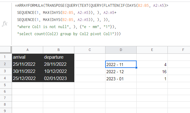 DEC 2022的牢房应显示16 (9晚在11/30/2022和12/10/2022之间+7晚在12/25/2022和1/02/2023之间)