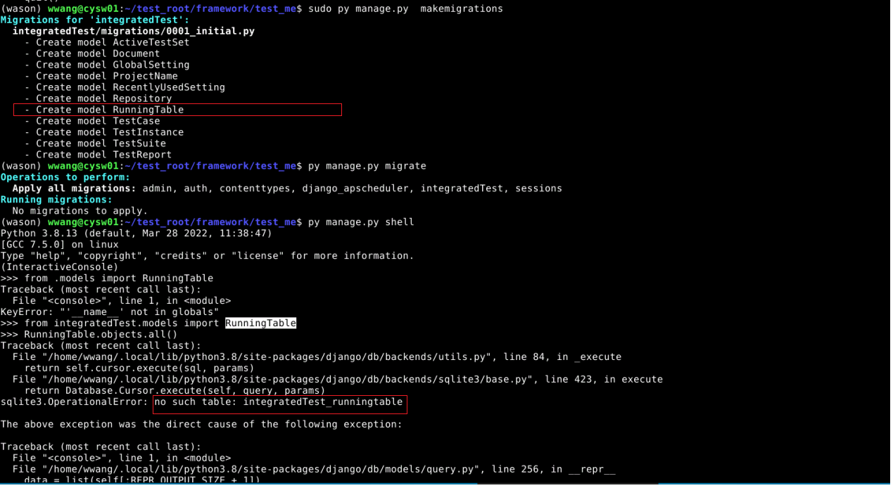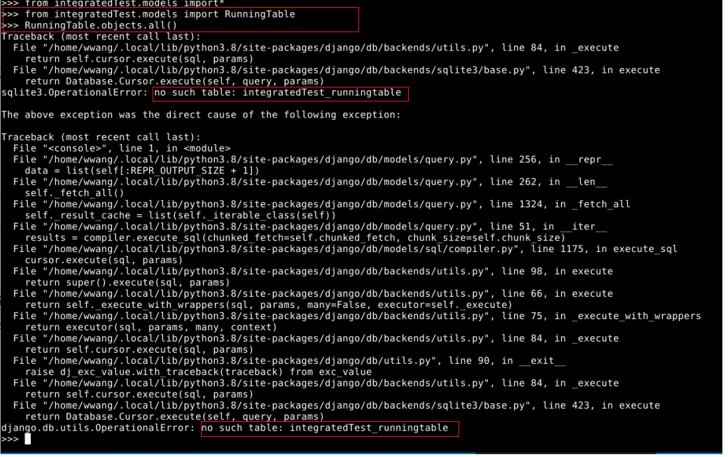 我试着用下面的图片来检查Django shell。正如您所看到的,我可以从正确的路径导入它。但是当我调用RunningTable.objects.all()时失败了。有人能告诉我为什么会发生这个错误吗?添加更多:这个表还没有数据。这有关系吗?
