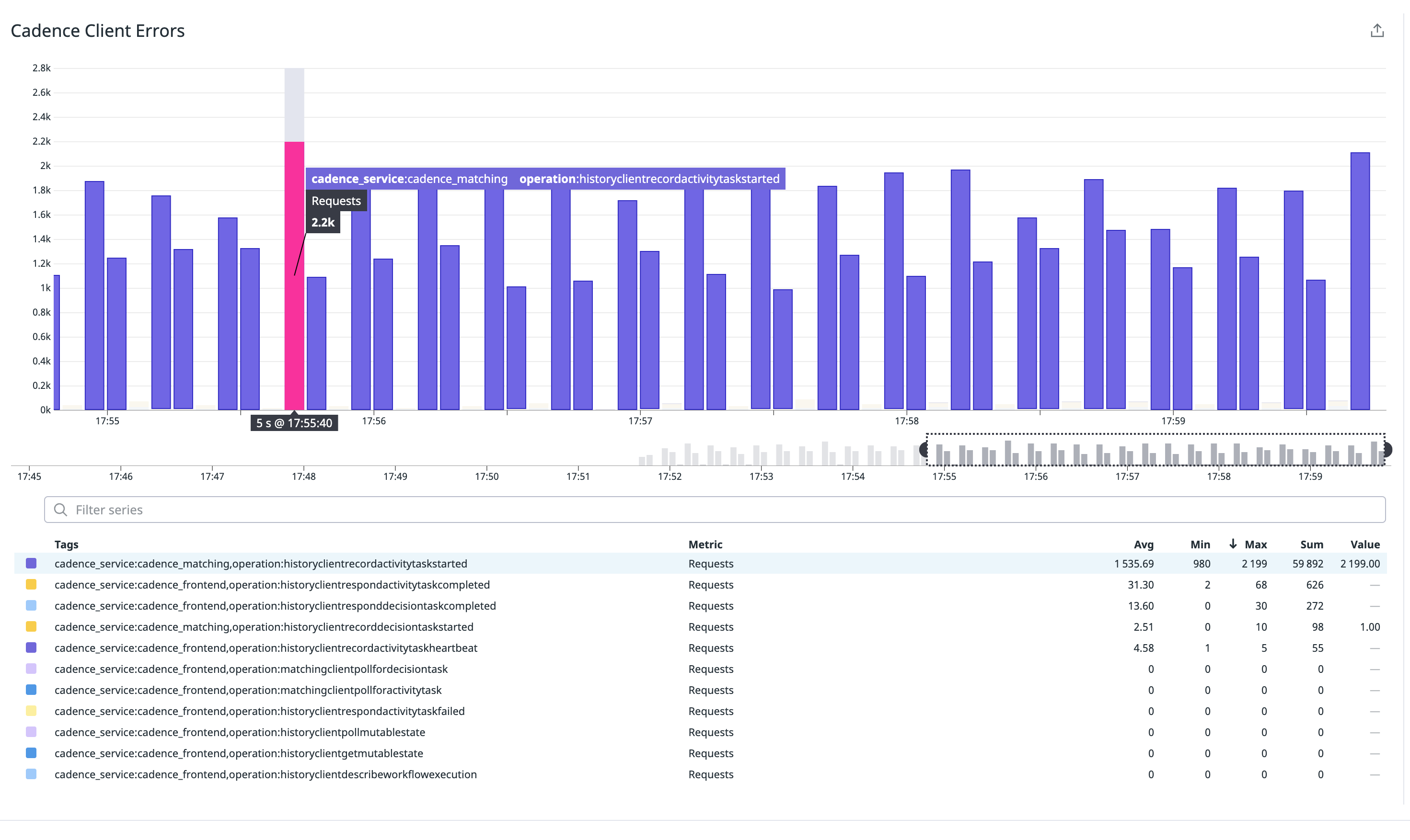 我们试图为我们的cadence设置(目前运行在两个EC2实例上: m5a.xlarge)做一个台式机测试,观察到了许多cadence客户端错误: