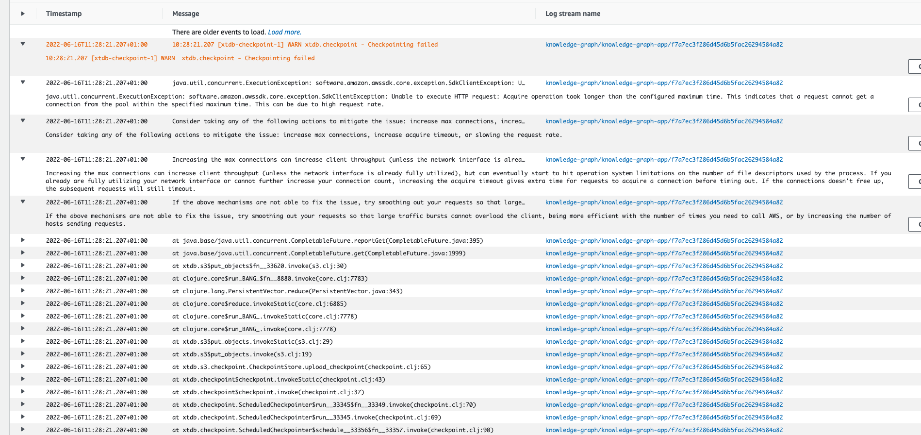 我使用部署在AWS/ECS (Fargate)上的XTDB1.21.0,配置了检查点(频率为30分钟),并存储在S3桶(RocksDB)上。经过几个成功的检查点之后,由于对AWS的HTTP请求中出现了异常,它们似乎经常失败,并发出XTDB警告,如下所示: