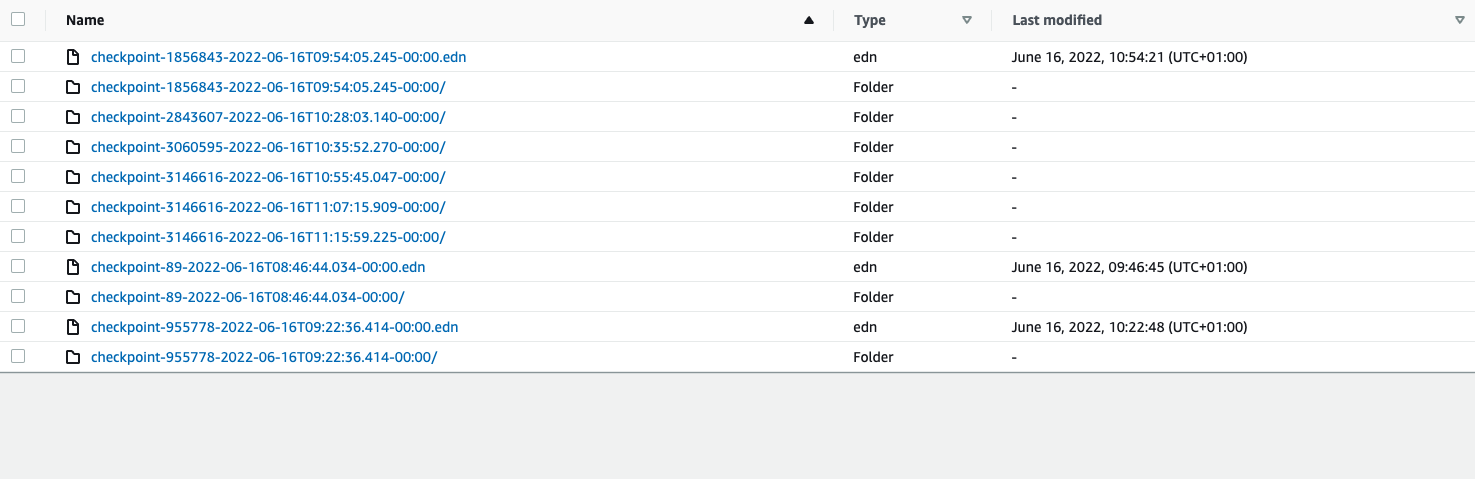 这给S3桶留下了不完整的检查点(即包含一组RocksDB文件和其他RocksDB文件的文件夹,而没有相关的EDN文件):