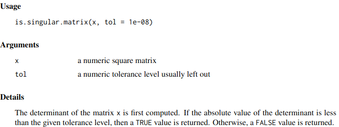 matrixcalc::is.singular.matrix是基于行列式的,所以不要相信它。此外,它的结果过于主观,因为您可以调整tol。