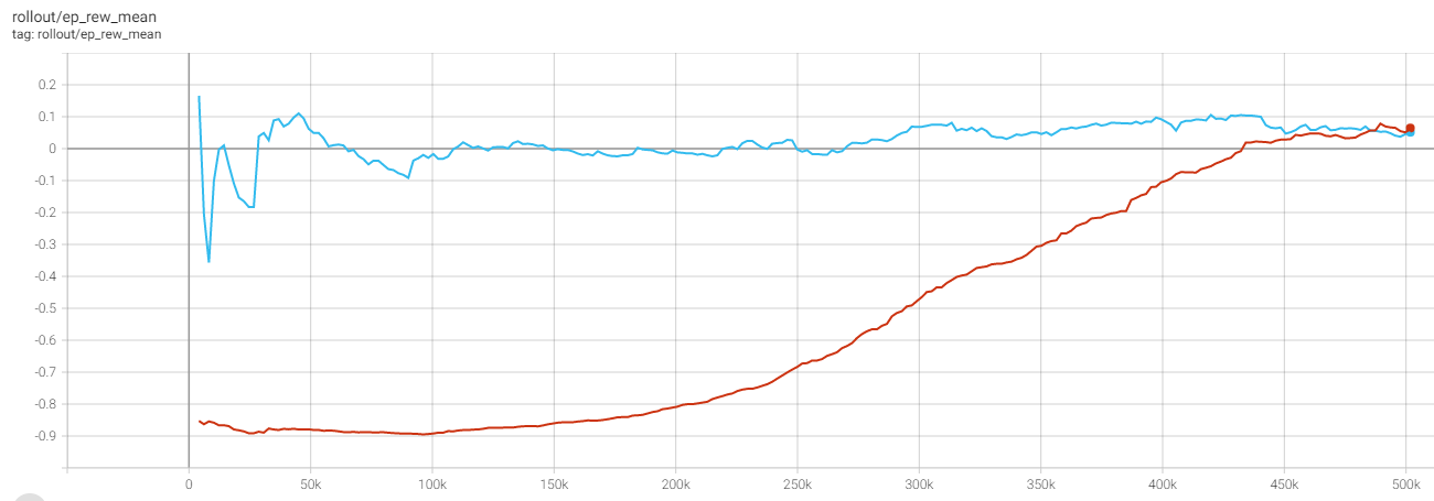 红线是在通过model=PPO(.)创建我的模型之后,调用model.learn(500000)时的平均插曲奖励。蓝线是当第一次model.learn(500000)训练结束后,我再次打电话给model.learn(500000)时的平均插曲奖励,我以为这只会继续以前的model.learn()停止的训练。