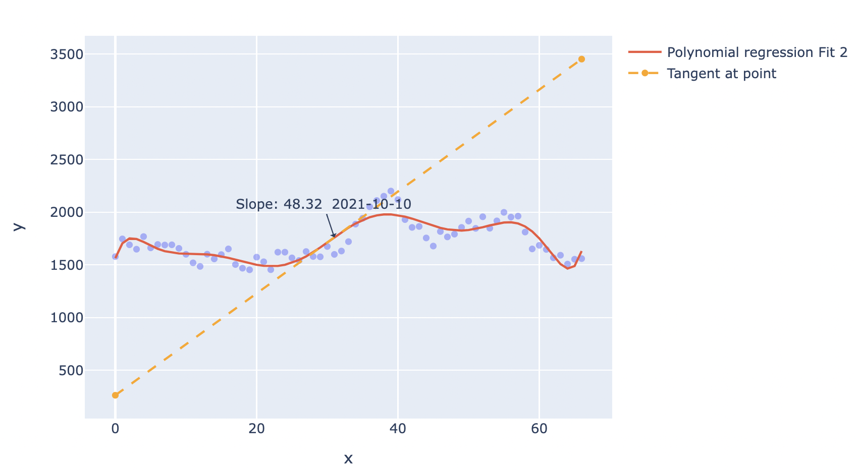 fig.show()如何计算多项式回归线特定点上的斜率(=切线)?