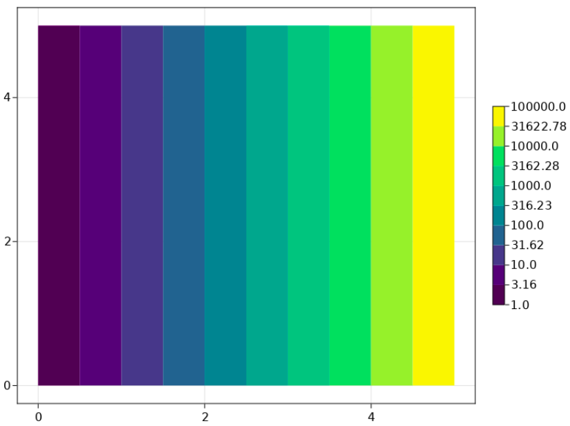 如何处理contourf图在Julia中的对数刻度?(使用Makie.jl)我只想用10到10000的值来绘制一个二维数据文件,并使用对数色条,但是我找不到怎么做。我已经看到在heatmap中有一个关于这个主题的公开问题,但是我找不到关于contourf的任何东西。