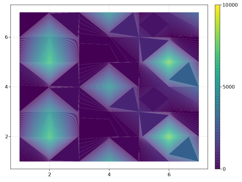 julia> fig, ax, im = contourf(1:7, 1:7, v, levels=0:50:10000)