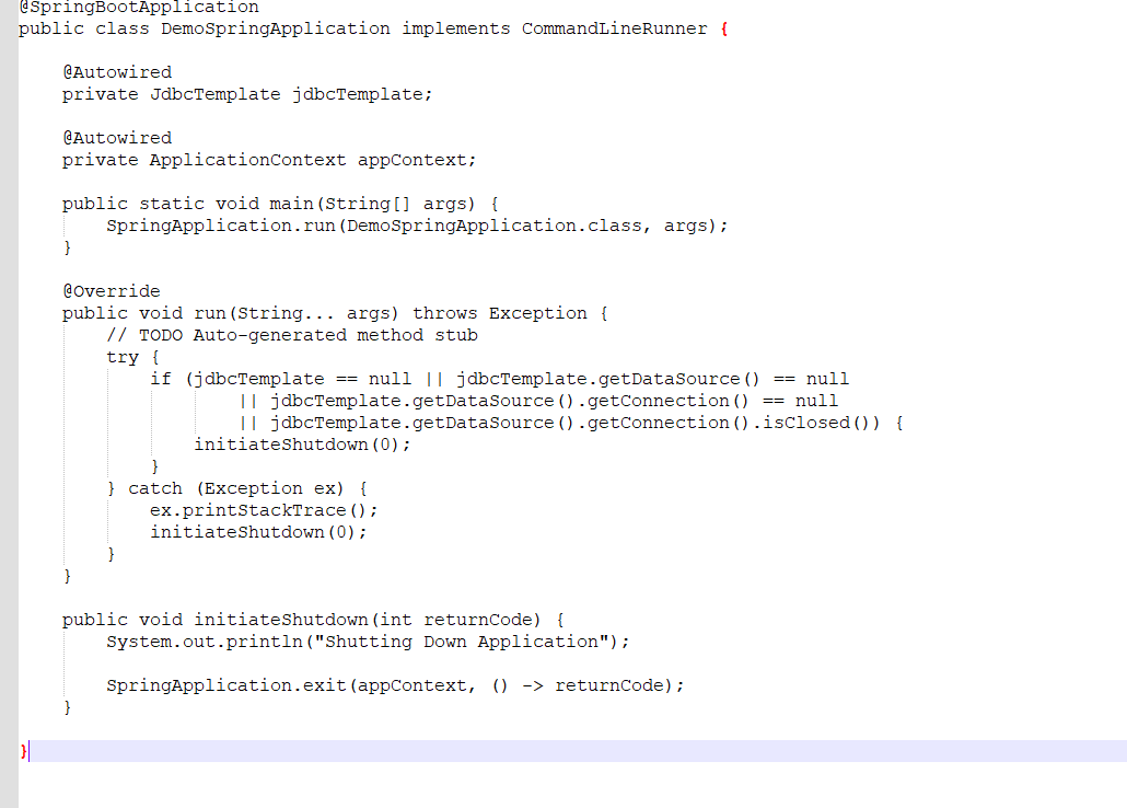 在我的spring引导应用程序中,我们连接到oracle数据库。尝试连接DB 2-3次之后,如果DB连接失败,我希望我的应用程序自动关闭。我该怎么做呢?