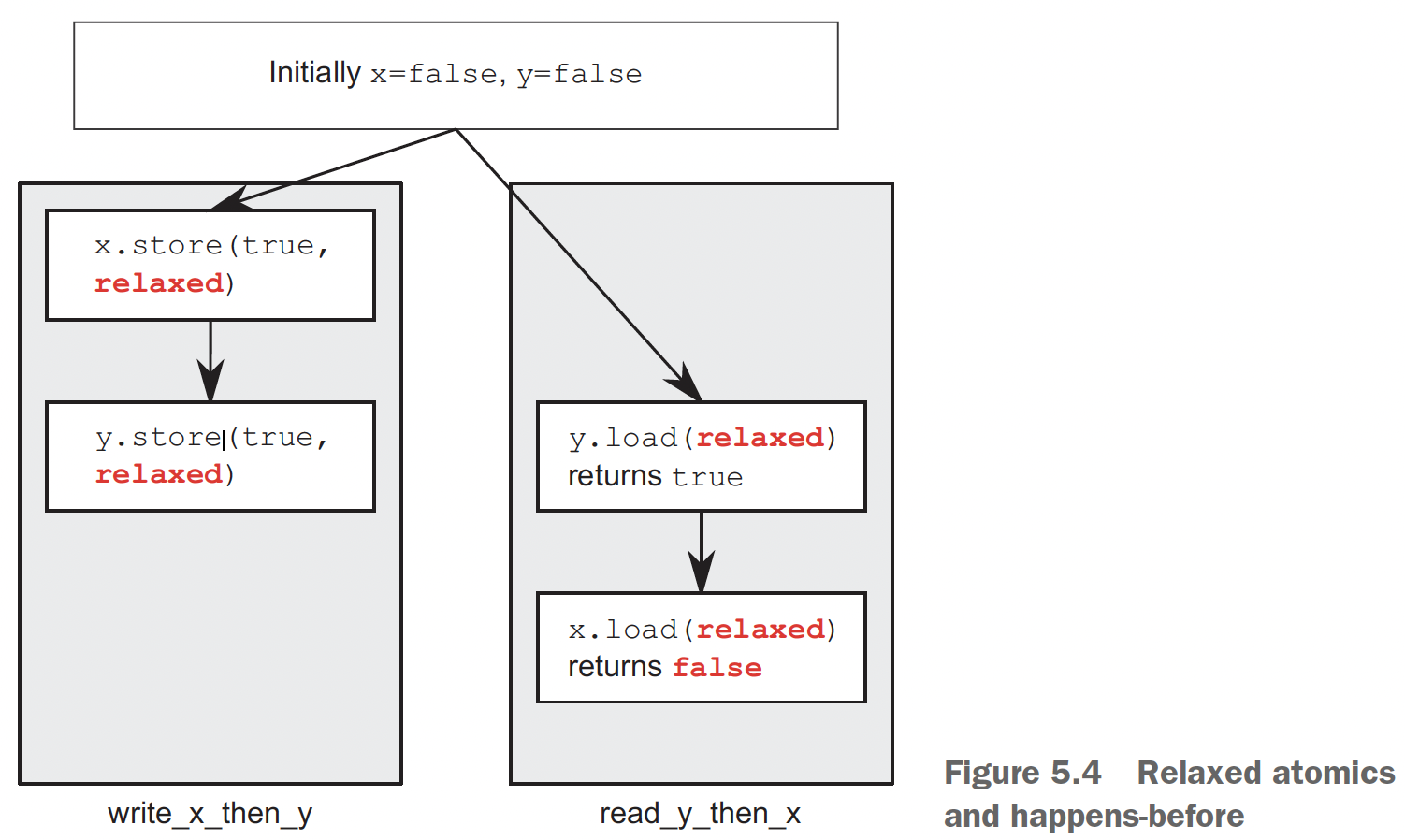}让我困惑的是函数void write_x_then_y()。作者说,“这次在main() can 末尾的断言”和关于原子变量x的语句(1)在与原子变量y的语句(2)的“发生之前”的关系。但是我认为在std::memory_order_relaxed,中不同的原子变量之间没有同步,编译器/CPU可以在不违反程序语义的情况下重新排序这两条语句。