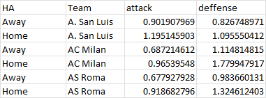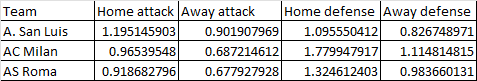 Team Away attack Home attack Away defense Home defense