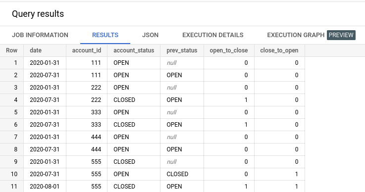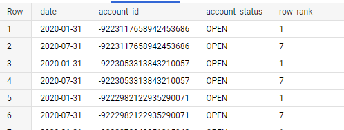 SELECT '2020-01-31' date, 1 account_id, 'OPEN' account_status, 1 row_rank UNION ALL