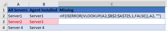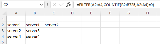 我试图比较两个服务器列表,看看哪些服务器没有安装代理。在第A行中,我们拥有的所有服务器(725个单元)和第B行中安装了代理的服务器(540个单元)。最后,在行C上,我希望显示缺少的服务器,这些服务器还没有代理。