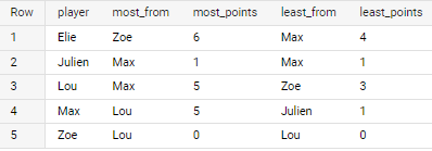 在BigQuery中,我想知道每个球员中,谁赢得的分数最多,得分最少。