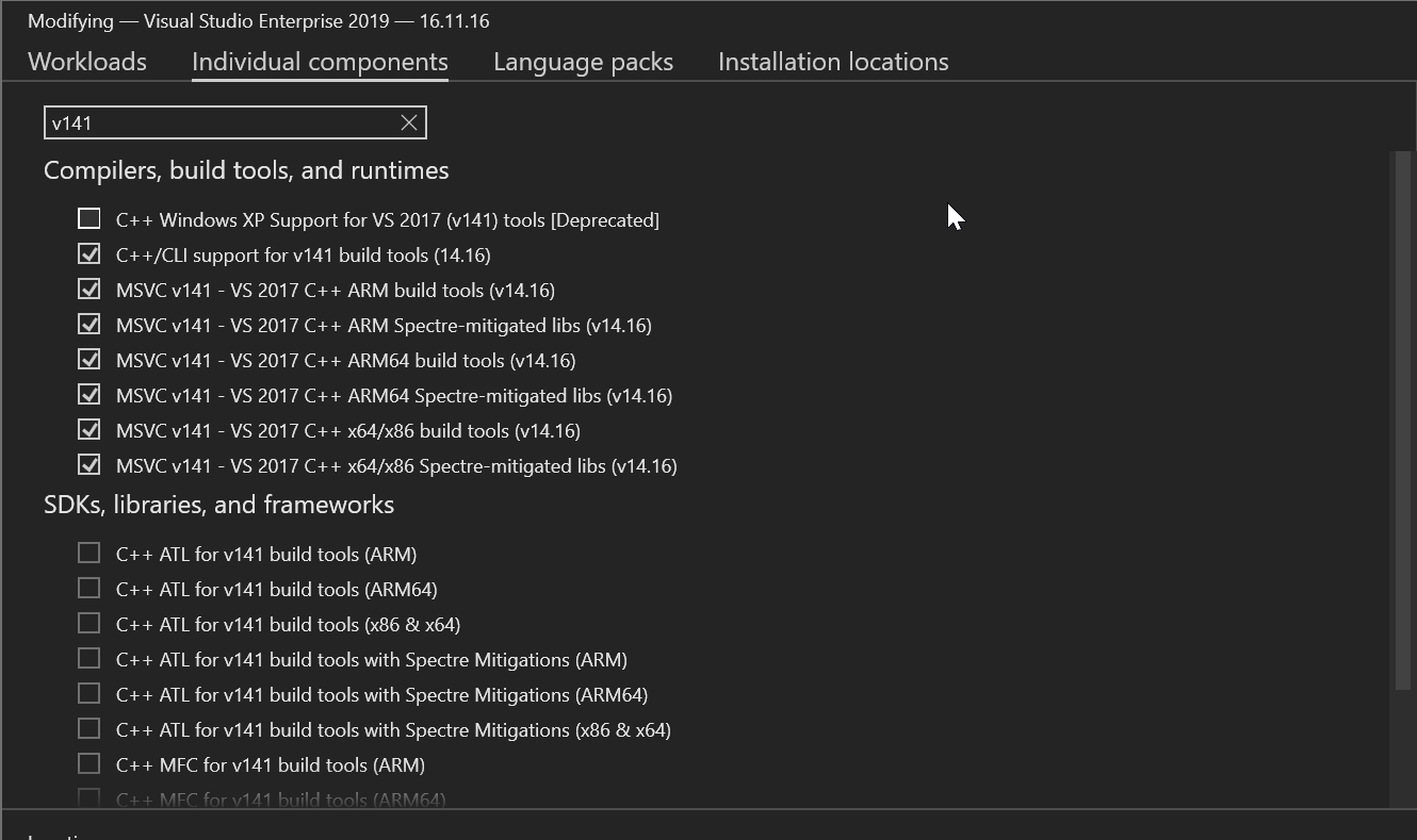 Microsoft错误Studio\2019\Enterprise\MSBuild\Microsoft\VC\v160\Microsoft.CppBuild.targets(439,5):MSB8020:无法找到用于VisualStudio2017的构建工具(Platform = 'v141')。若要使用v141生成工具进行生成,请安装VisualStudio2017生成工具。