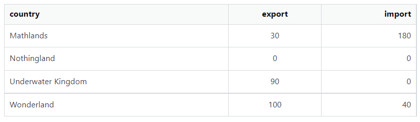 编写由三列组成的返回表SQL查询: country、export、import,其中包含每个国家的进出口货物的值之和。每个国家都应出现在本表中,结果应越来越多地按国家进行排序。