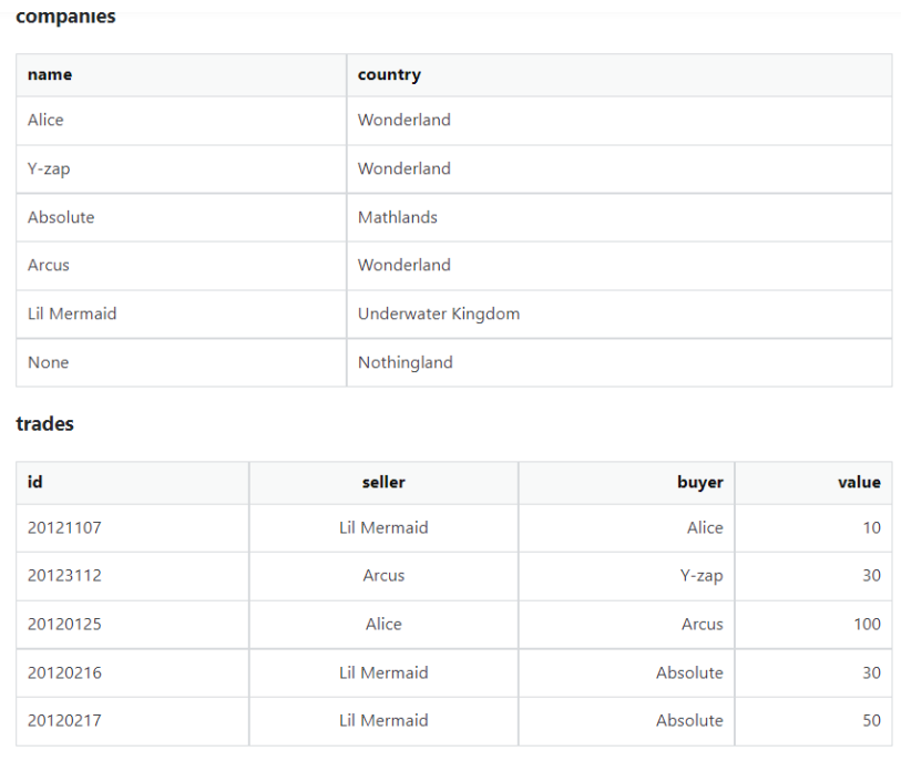 其任务是编制一份摘要,其中包括每个国家进口和出口货物的价值总额。请注意,当一家公司购买某些商品时,它对其国家的总进口额做出了贡献;当该公司出售一些货物时,它对其国家的总出口做出了贡献。