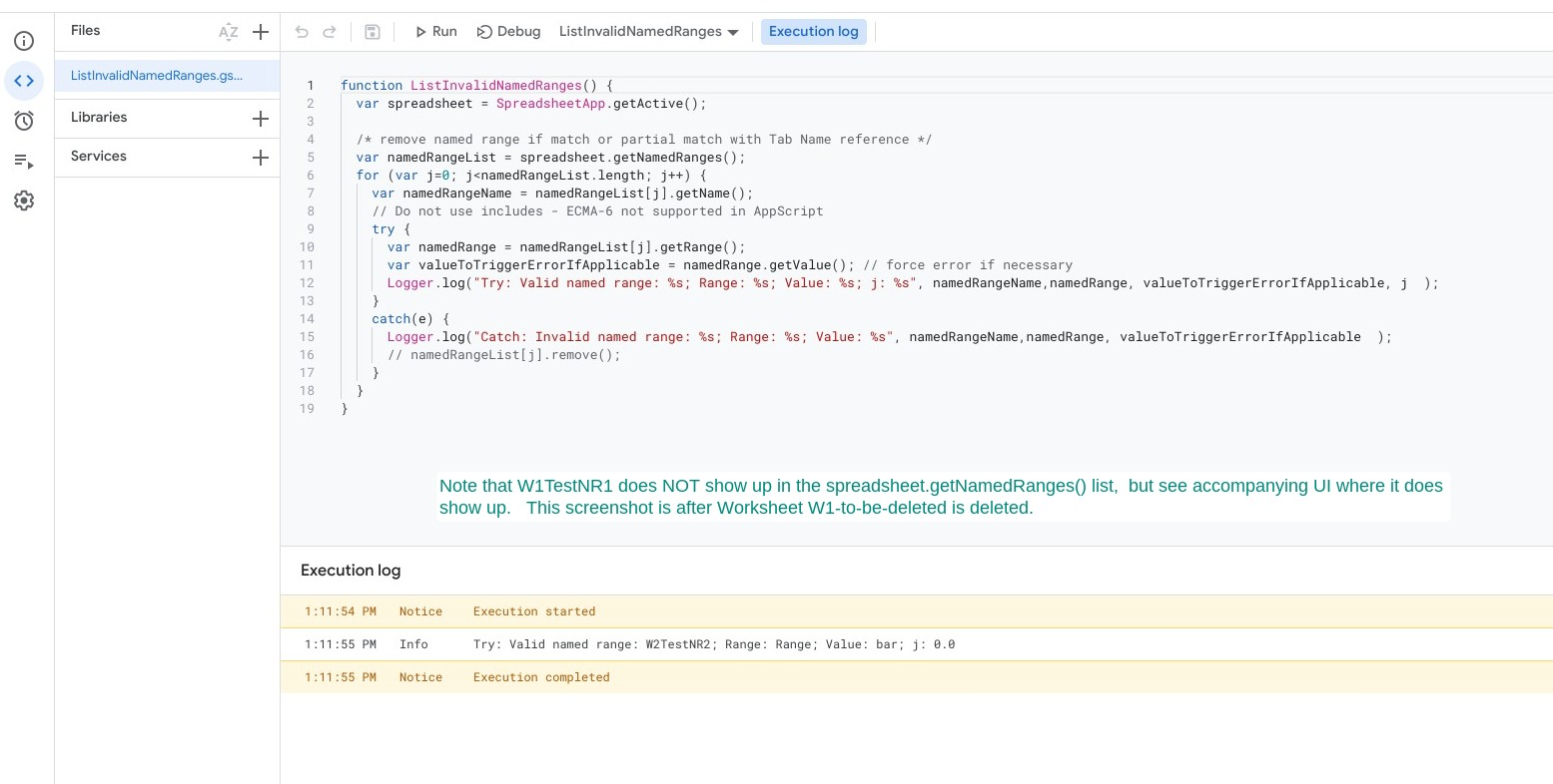 当前,方法Sheet.getNamedRanges()返回工作表上的每个命名范围(有效和无效)(.)为了举例说明这种行为,我创建了一个包含三个范围的新工作表,并删除了其中两个范围的列,使其无效。然后,我根据描述的解决方案编写了这段代码: //(一些代码和一些日志) 无效的命名范围很容易与有效的范围区分开来。请尝试复制这种方法,如果它无助于分享您如何创建无效范围和使用的代码,那么我可以继续研究这个问题。