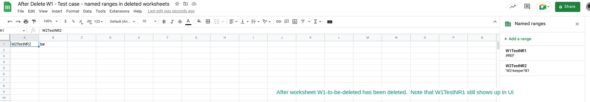 getSheets()方法似乎没有跟踪已删除的工作表,看我们是否可以直接引用它们来搜索范围。getRangeByName()也会返回null。Sheets.Spreadsheets.get()来尝试高级服务,它也只列出了未删除的表单中的namedRanges。考虑到这与“纯”API调用几乎相同,这似乎不仅仅是一个应用程序脚本问题。你也可以在谷歌的API资源管理器上测试它。我的建议是去问题跟踪器尝试重新打开bug,或者仅仅是提交一份新报告,这可能会得到更快的关注。无论哪种方式,修复都可能需要一段时间,因此在删除工作表之前,您可能需要在代码中说明这个问题,并删除指定的范围。