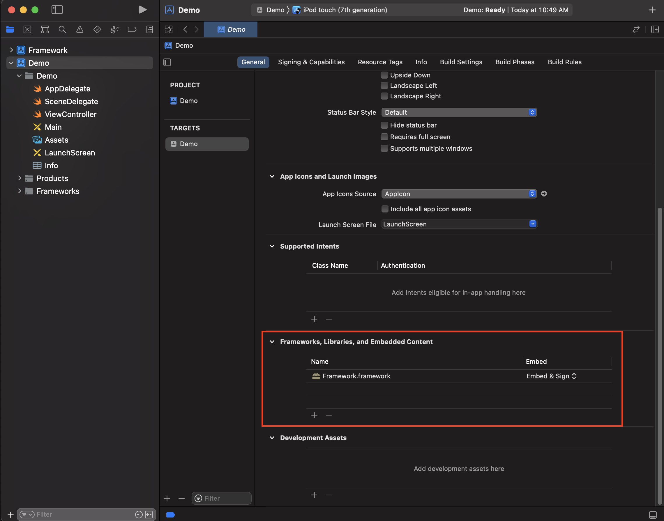 创建一个包含框架项目和演示应用程序项目并排的.xcworkspace,然后在演示应用程序目标一般设置(参见屏幕快照)中,从工作区中的框架项目中添加.framework文件,而不是直接依赖于.xcframework二进制文件。