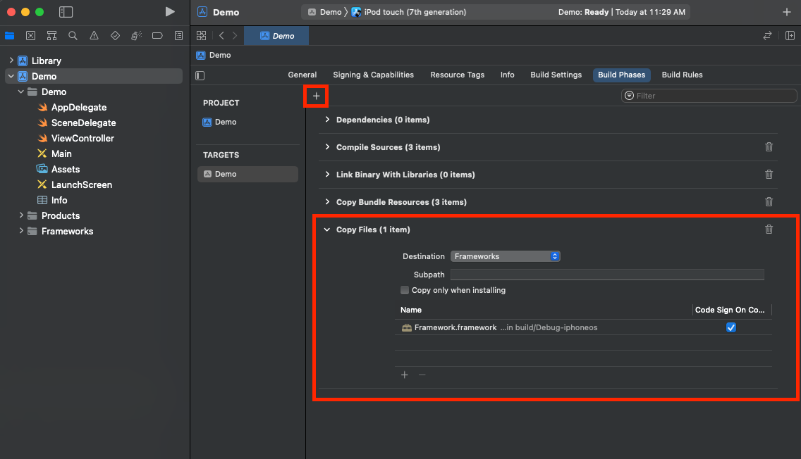 之后,添加一个包含框架文件的“复制文件”构建阶段。
