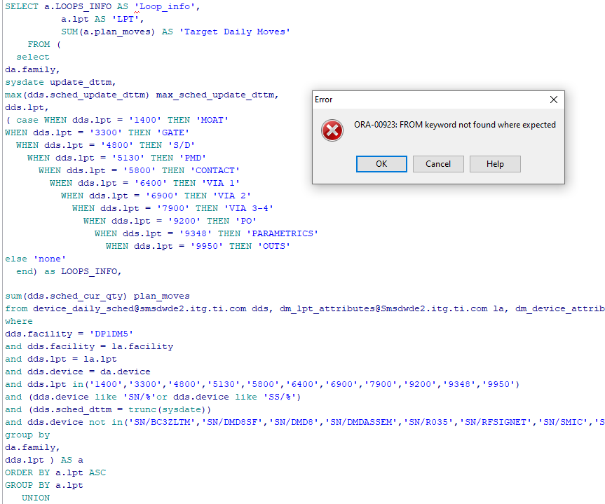 dds.lpt ) AS b 相同的输出错误: ORA-00923: FROM关键字未在预期的位置找到