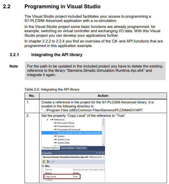 西门子在这里提供了PDF文件中的文档:SIMATIC S7-PLCSIM高级。本文档第2.2节帮助Visual集成。如果URL过时了,下面是与这个问题相关的部分。