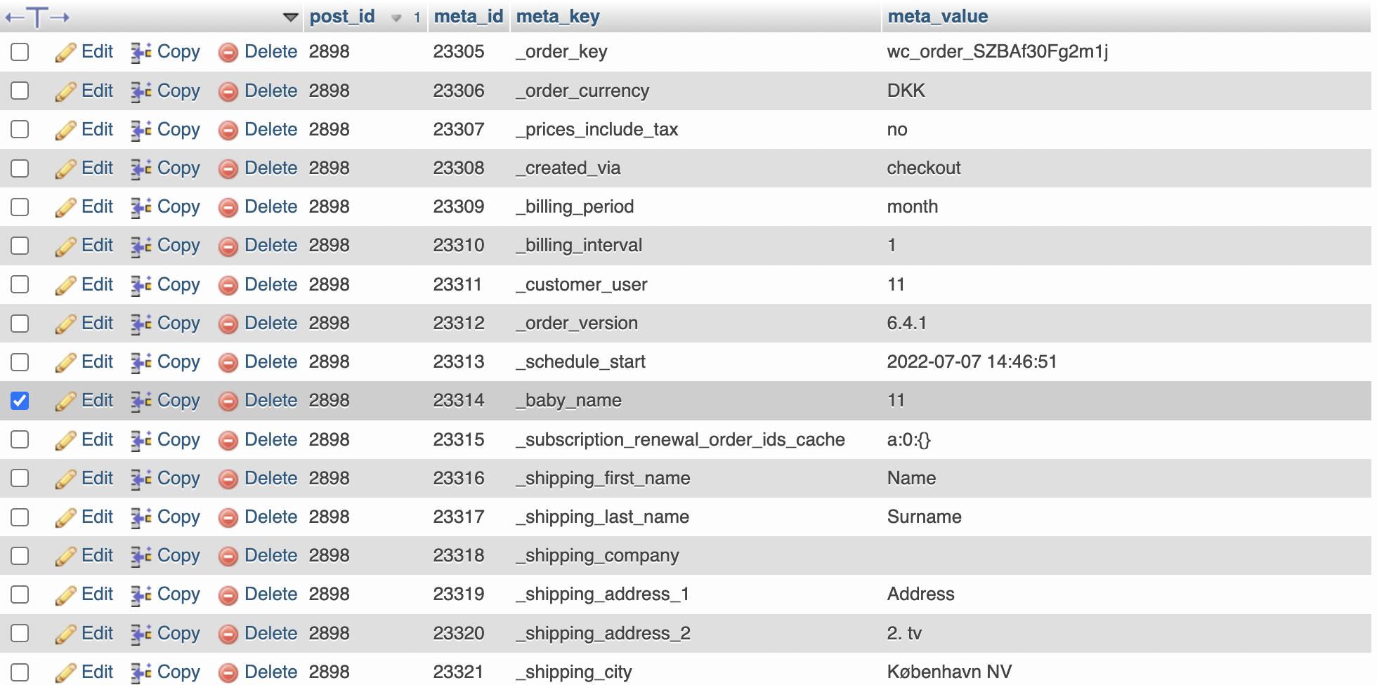 }我可以确认这是可行的,因为我可以在_baby_name字段中看到meta_key字段中的行,在meta_value字段中看到我的用户id用于使用id 2898进行订阅,而我最近将其放在sites _postmeta数据库表中:
