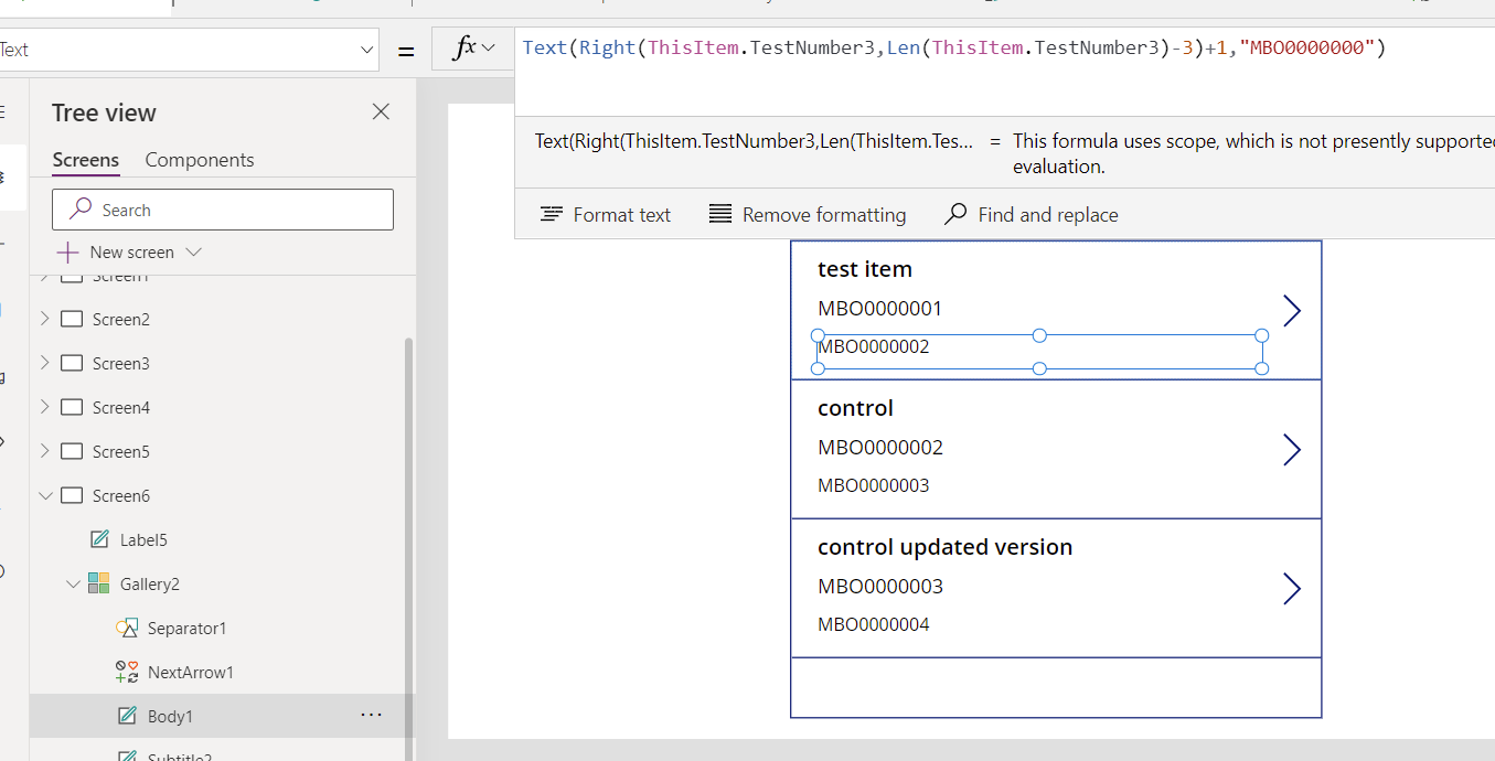 Text(Right(ThisItem.TestNumber3,Len(ThisItem.TestNumber3)-3)+1,"MBO0000000")