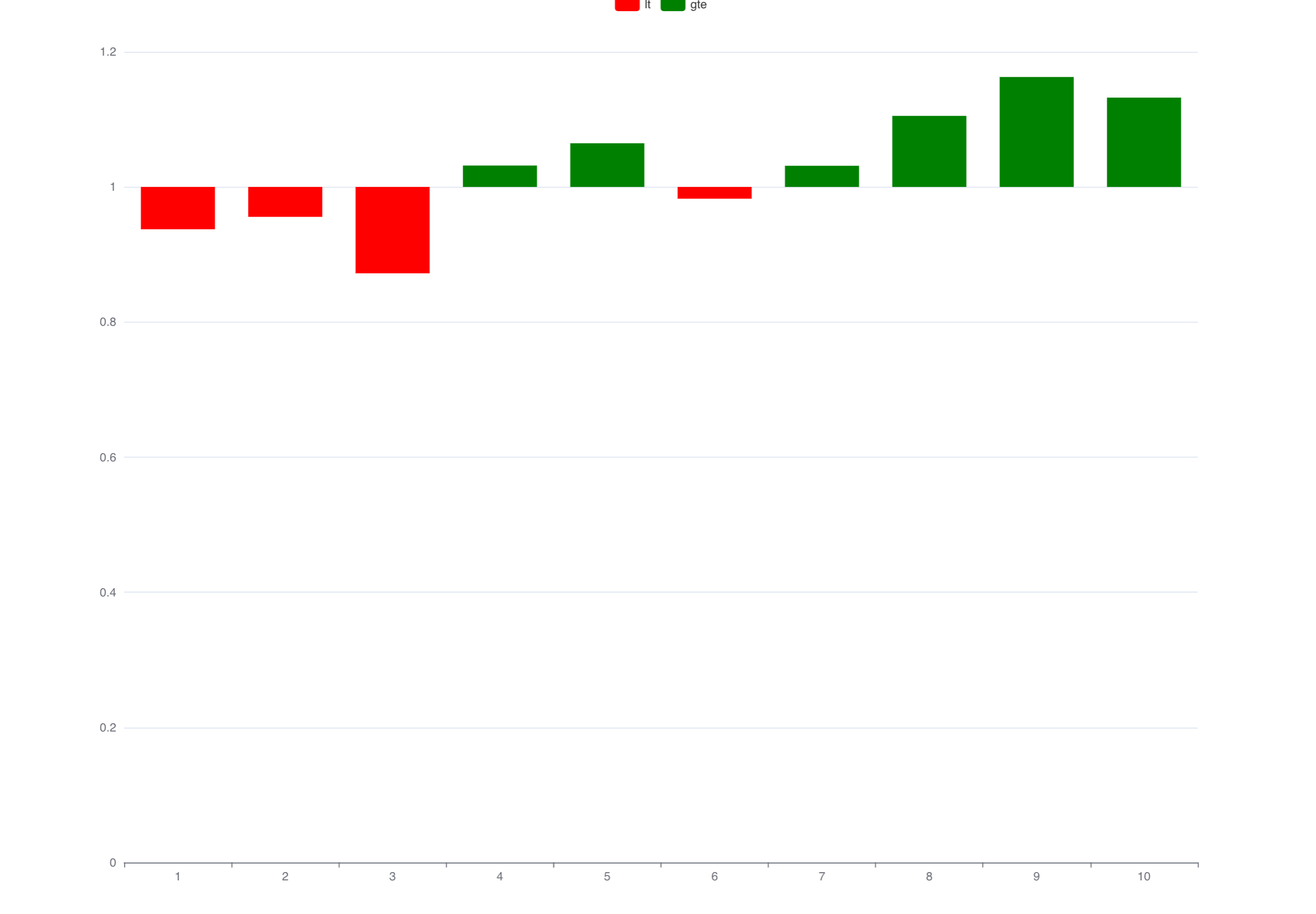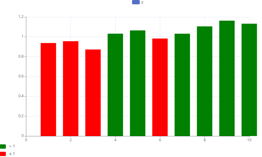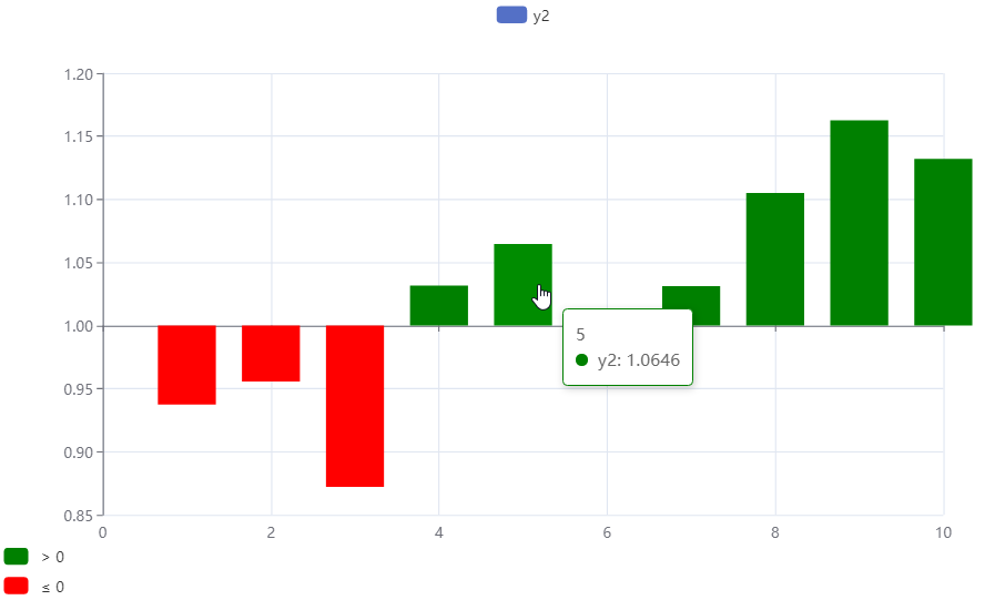 我想使用echarts4r来绘制一个条形图,其中一个截止点上方的值是绿色的,下面是红色的,而条形图是从这个值开始的。如果截止值为0,我们可以使用提供的答案( here ),对于其他值(如下面的示例中的1),这样做的效果并不好,因为条形图总是从零开始。有什么方法可以让酒吧从其他值开始吗?