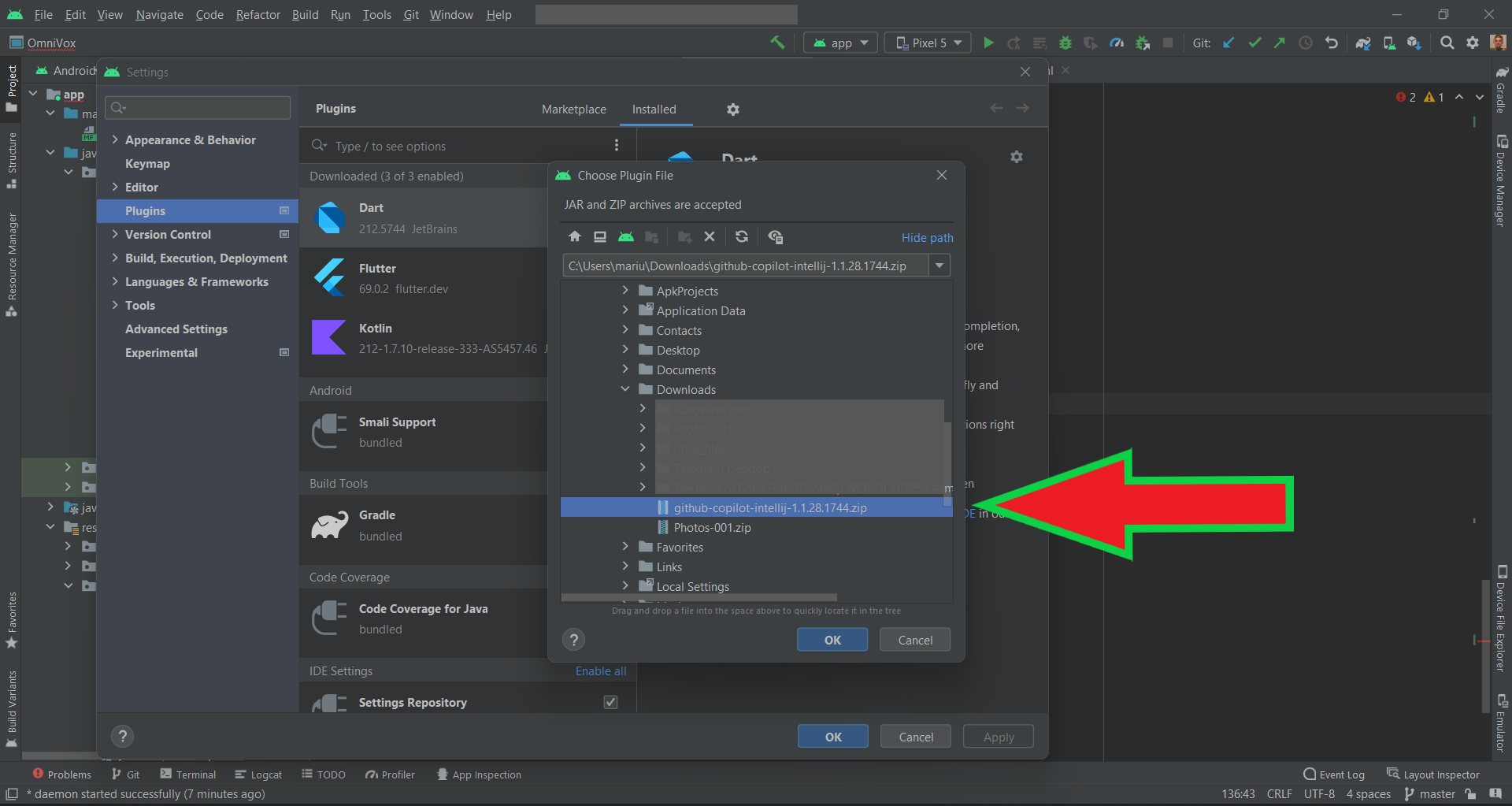 是的,您需要访问JetBrains 市场,下载最新的Copilot插件版本,然后在Android中手动安装。请看附图。转到设置