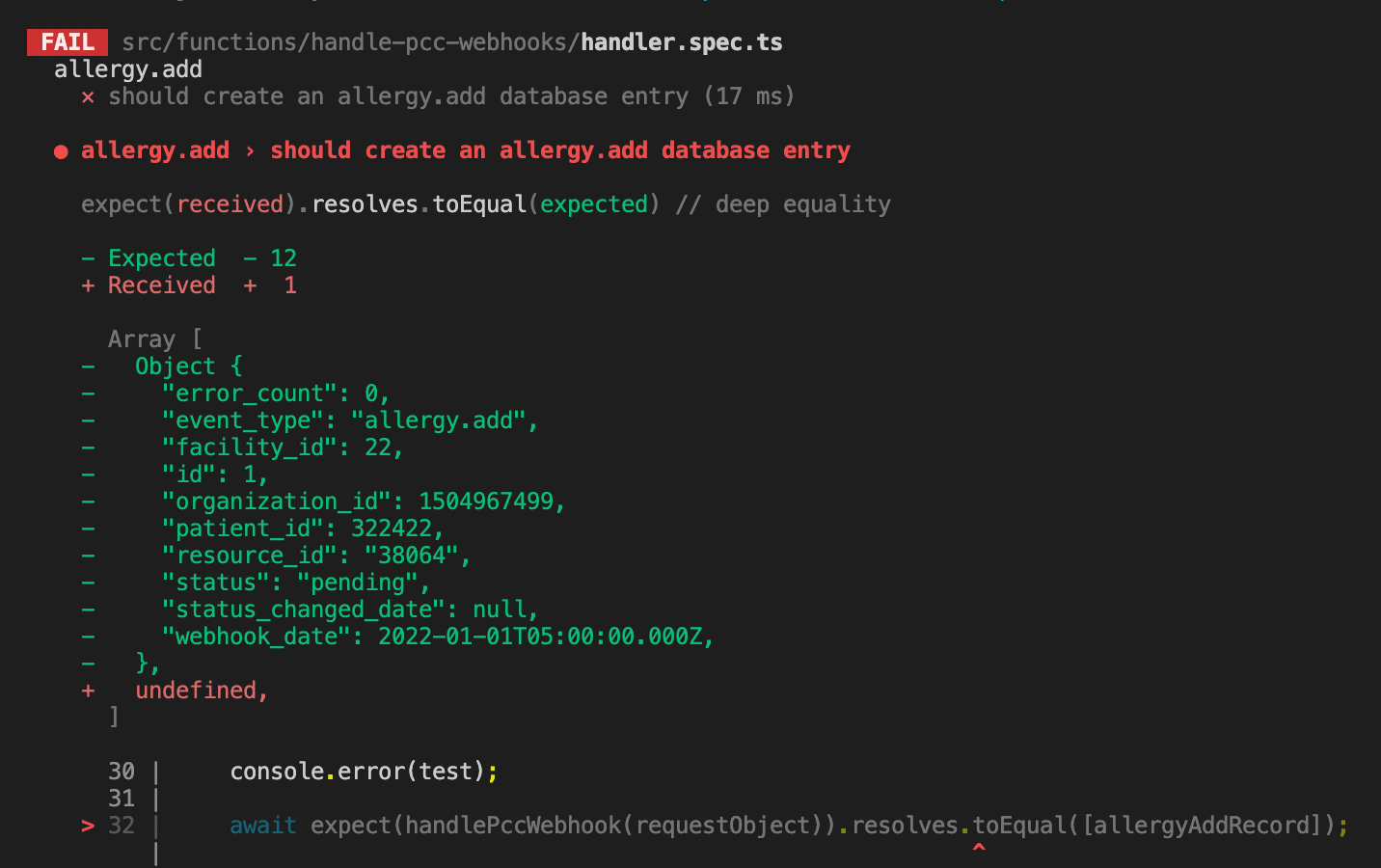 export const prismaClinicalMock = prisma as unknown as DeepMockProxy<PrismaClient>;到目前为止,所有事情都遵循Prisma单元测试文档概述的约定。我所做的唯一的修改就是让它成为特定于数据库的东西。下面是我的功能和测试。handle-pcc-webhooks.ts中的请求对象是一个示例http请求对象,它的主体包含我关心的web钩子数据。