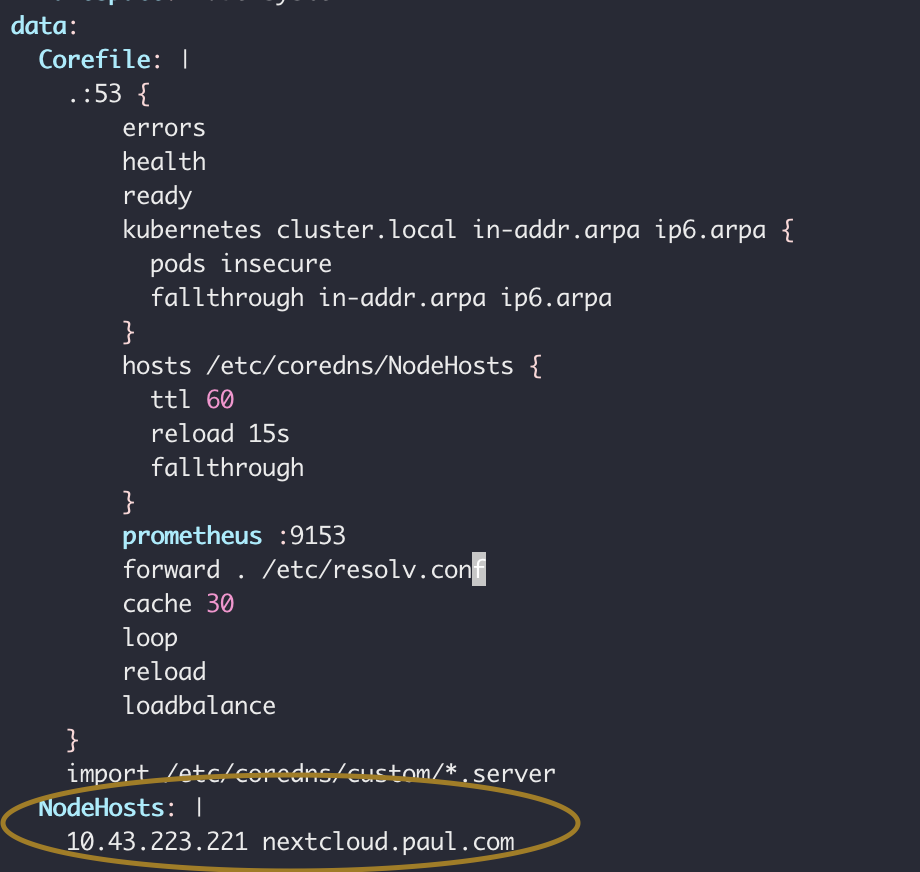 10.43.223.221 nextcloud.local在我的/etc/host中,允许我访问实例,但是如果我在Corefile中添加一行(如下图所示),将nextcloud.local路由到10.43.223.221,什么都不会发生。
