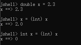 int x = (int)x右边的x与您先前声明的x不同。所以它的值默认为0,所以(int)x是0。通常您不可能有两个x变量。这是jshell允许您做的事情,但是在正常的Java中,您不能这样做。