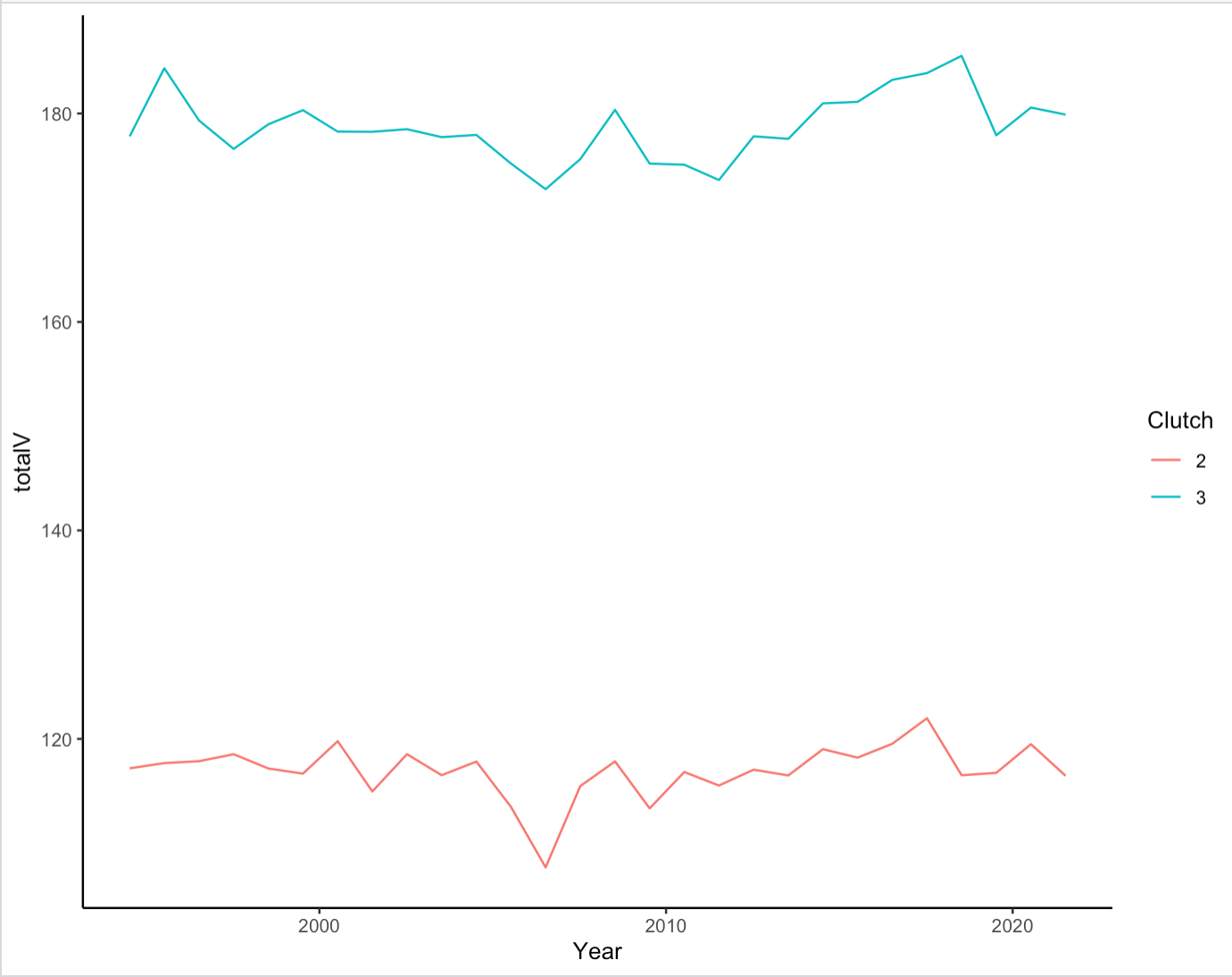 ggplot(aes(x= Year, y = totalV, group = Clutch, color = Clutch)) +