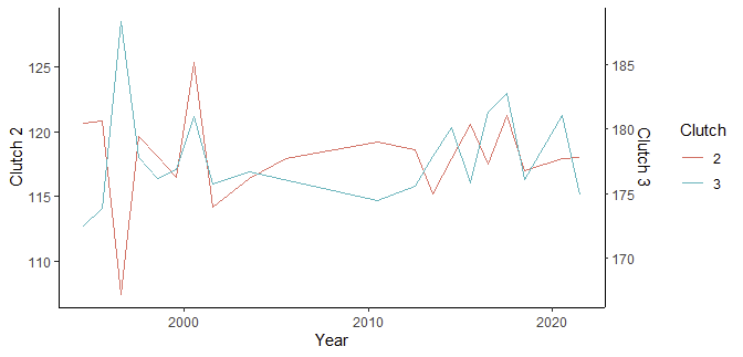 scale_y_continuous(name = "Clutch 2", sec.axis = sec_axis(~ . + diff(means), name = "Clutch 3")) +