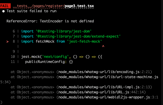 fetchMock.enableMocks()但是,我一直收到错误"ReferenceError: TextEncoder未定义“。有人能帮忙吗?