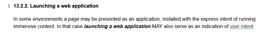 我知道用户交互需要在网络上启动沉浸式的VR/AR应用程序,但似乎允许直接启动是3D专用WebXR PWAs的一个重要功能。