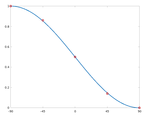 我可以用正弦平方得到你的数字,从90减去你的输入,得到一半的结果,然后转换成弧度。