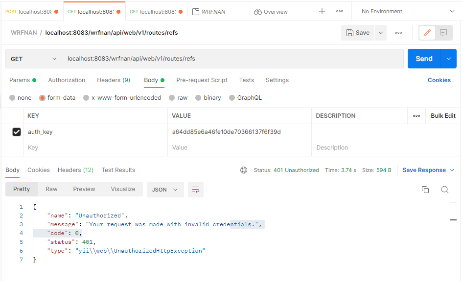 我正在研究yii2,并在本地机器上创建了一些REST API's. One is for authenticating the user and the second one is for getting the data by using the auth from the 1st API. I am usingxampp``。身份验证API运行得非常好。但是当我试图执行第二个API时,它给了我一个错误。下面是我的代码