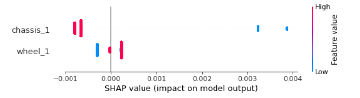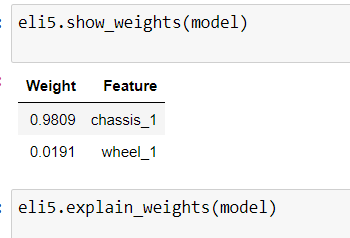 尽管如此,这些并不矛盾。shap图和eli5权重都表明chassis_1是更重要的变量:它的形状值(绝对值)更大,重要性得分也更高。