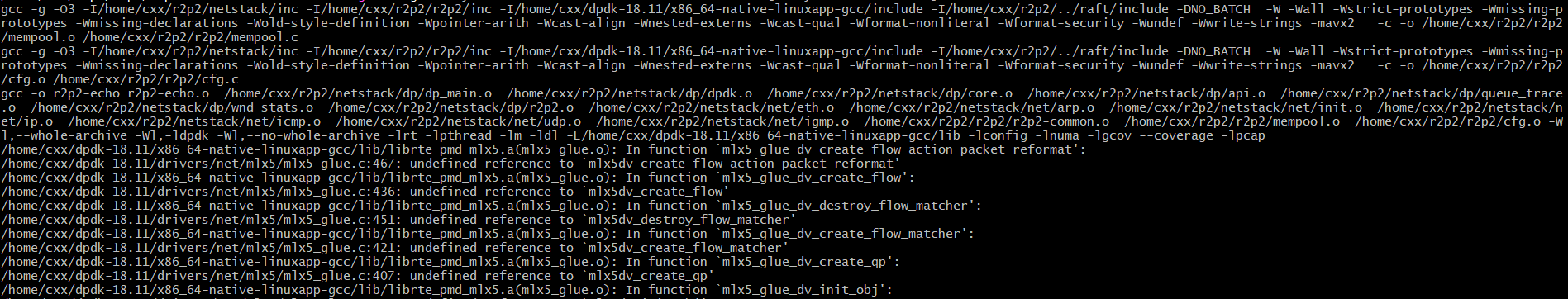 $(CC) -o $@ r2p2-echo.o $(OBJS_C) $(LDFLAGS) $(pkg-config --static --libs libdpdk)DPDK版本小于19.11 LTS的解决方案: