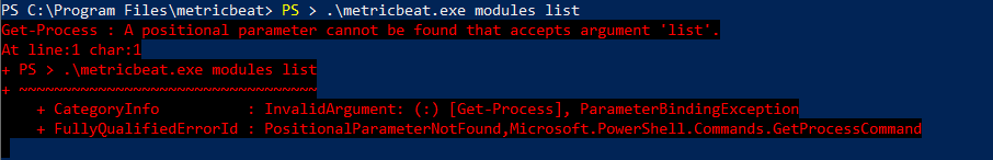 前者执行名为PS或get-process的应用程序的输出的重定向.\metricbeat.exe modules,其中输入.\metricbeat.exe modules和list参数。