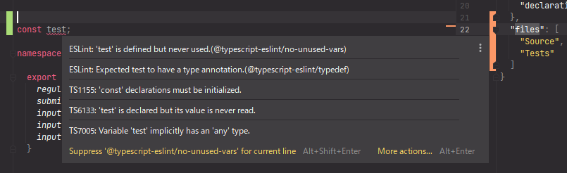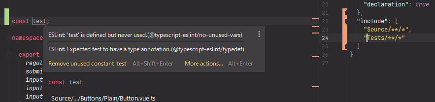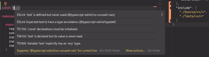 在include的情况下,虽然"include": [ "Source/**/*", "Tests/**/*" ]是有效 TypeScript配置,但IDE不会理解它: